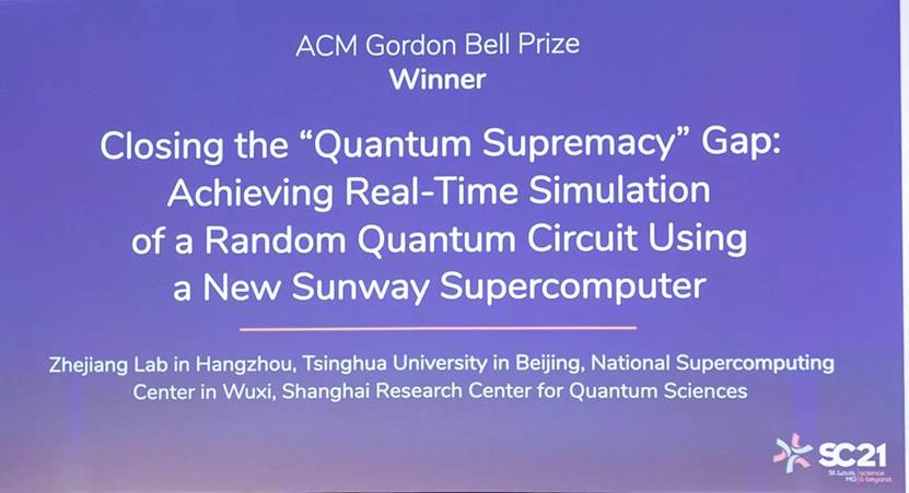 On the afternoon of November 18 (U.S. time), the 2021 Association for Computing Machinery (ACM) Gordon Bell Prize, the highest international honor in the field of supercomputing application, was announced at a hybrid virtual/in person supercomputing (SC21) conference held in St. Louis, U.S. state Missouri. The Chinese supercomputing team won the honor for its achievement “Closing the Quantum Supremacy Gap: Achieving Real-Time Simulation of a Random Quantum Circuit Using a New Sunway Supercomputer” (SWQSIM).