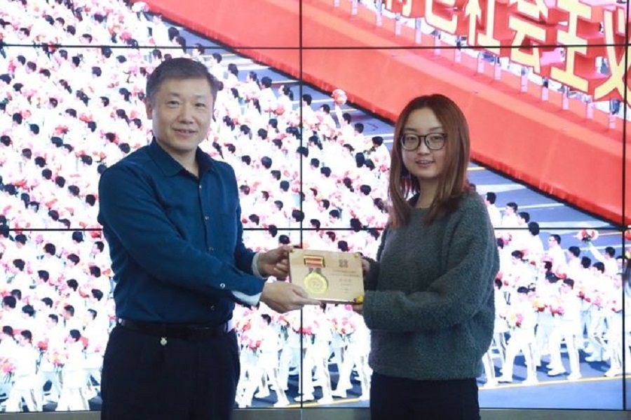 Teacher Wu Haiping presents medals and photos for students participating in special activity