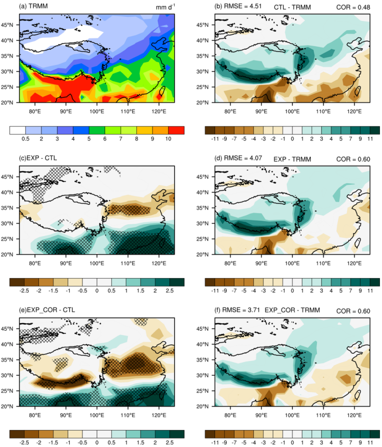 The original scheme of the research group did not consider the potential relationship between the subgrid sensible heat flux and the latent heat flux, that is, the subgrid partitioning of the surface heat fluxes. To address this problem, the research group proposes a novel improvement scheme, that is, introducing the correlation coefficient of subgrid sensible heat and latent heat fluxes, partitioning the randomly selected sensible heat and latent heat fluxes according to the correlation coefficient, and then driving the PBL and convection process, and averaging the obtained results and transmitting them to other physical processes. The simulation results of the new scheme maintain the improvement effect of the original scheme on summer precipitation in eastern China, and significantly reduce the excessive biases of the current global climate model in summer precipitation simulation in the eastern and southern margins of the TP (Fig. 1).