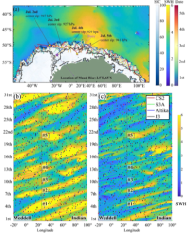 Given the vast extent of the Southern Ocean marginal ice zone, the coverage by a single satellite is insufficient. Through spatiotemporal fusion of four altimetry satellites (Fig. 1b/c), systematic coverage of cyclones and weather-scale processes in the marginal ice zone has been achieved. Observations reveal an intense storm event and its wave impacts on the marginal ice zone in the Weddell Sea–Indian Ocean sector of the Southern Ocean in July 2019 (Figure 1). Early that month, an explosive cyclone formed in this region, generating large waves exceeding 8 meters in height. These waves then entered the sea ice at 59°S, 10°E in the eastern Weddell Sea and propagated southward for more than 600 km.
