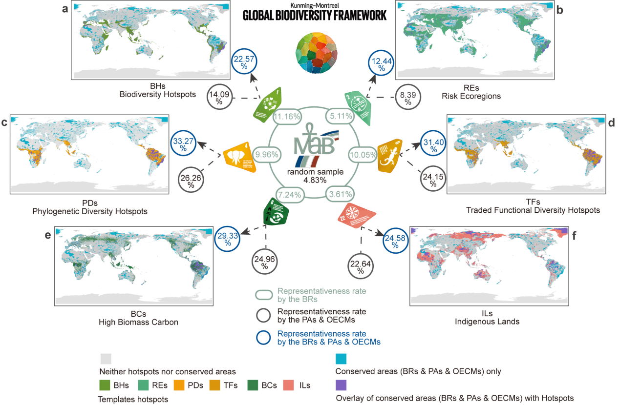 Figure 1 Spatial synergy potential of the Biosphere Reserve Network in advancing multi-target implementation of the Kunming-Montreal Global Biodiversity Framework.