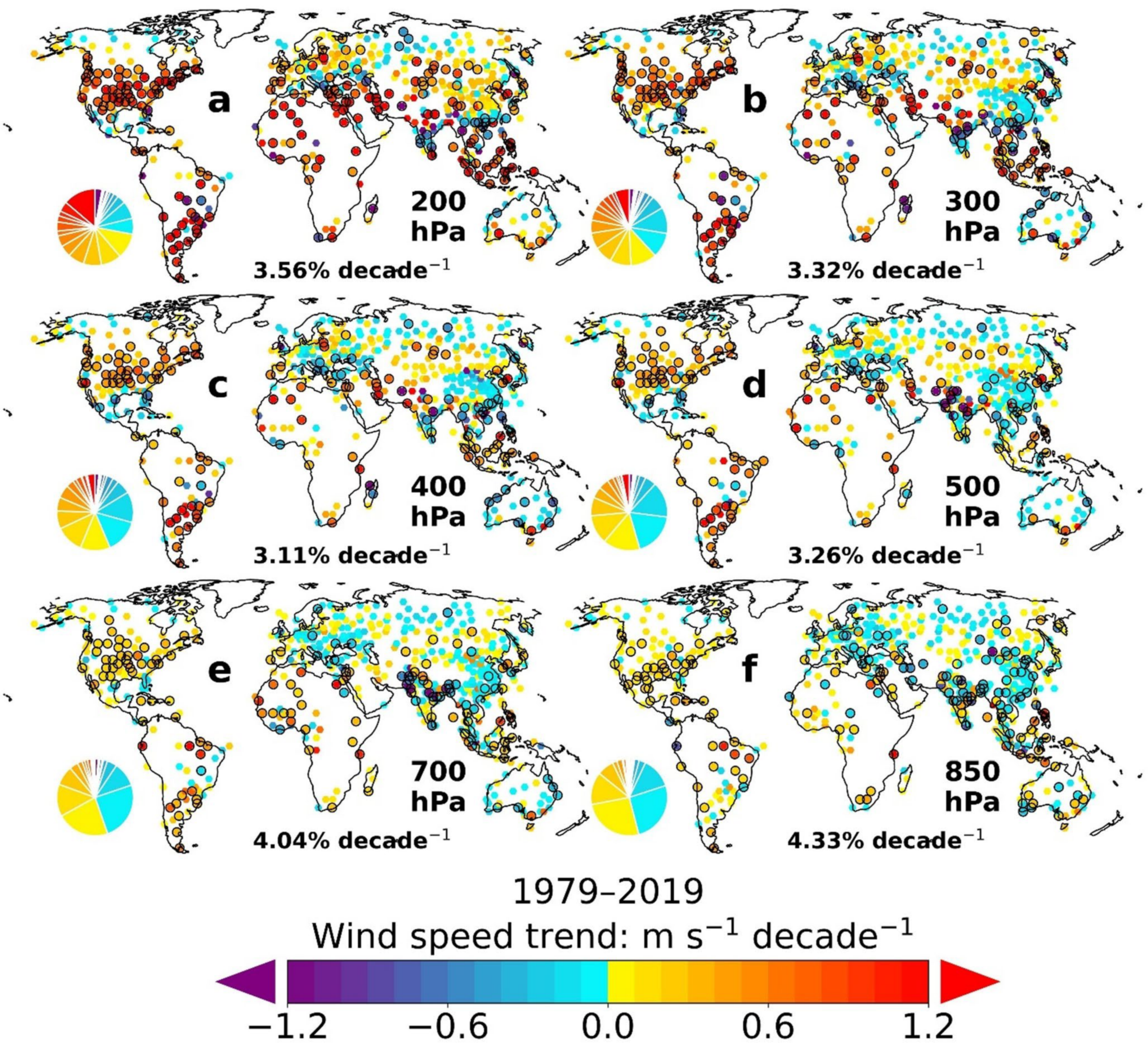 To address this scientific challenge, Academician Chen Deliang’s Research Group from the Department of Earth System Science (DESS), Tsinghua University, has conducted an in-depth analysis of wind speeds at six standard pressure levels (850–200 hPa) in the troposphere using the Integrated Global Radiosonde Archive (IGRA). The study reveals that over the past four decades (1979–2019), global upper-tropospheric wind speeds have exhibited a significant increasing trend (Figure 1). At upper levels (200–300 hPa), clear signals of wind speed enhancement are observed over most global land areas, except Australia, with particularly pronounced increases over North America and jet stream exit regions. In contrast, wind speed trends in the lower troposphere appear weaker and more spatially heterogeneous. This vertical asymmetry—stronger wind speed changes aloft than at low levels—reflects the complex coupling between large-scale temperature gradient adjustments and regional circulation responses under global warming.