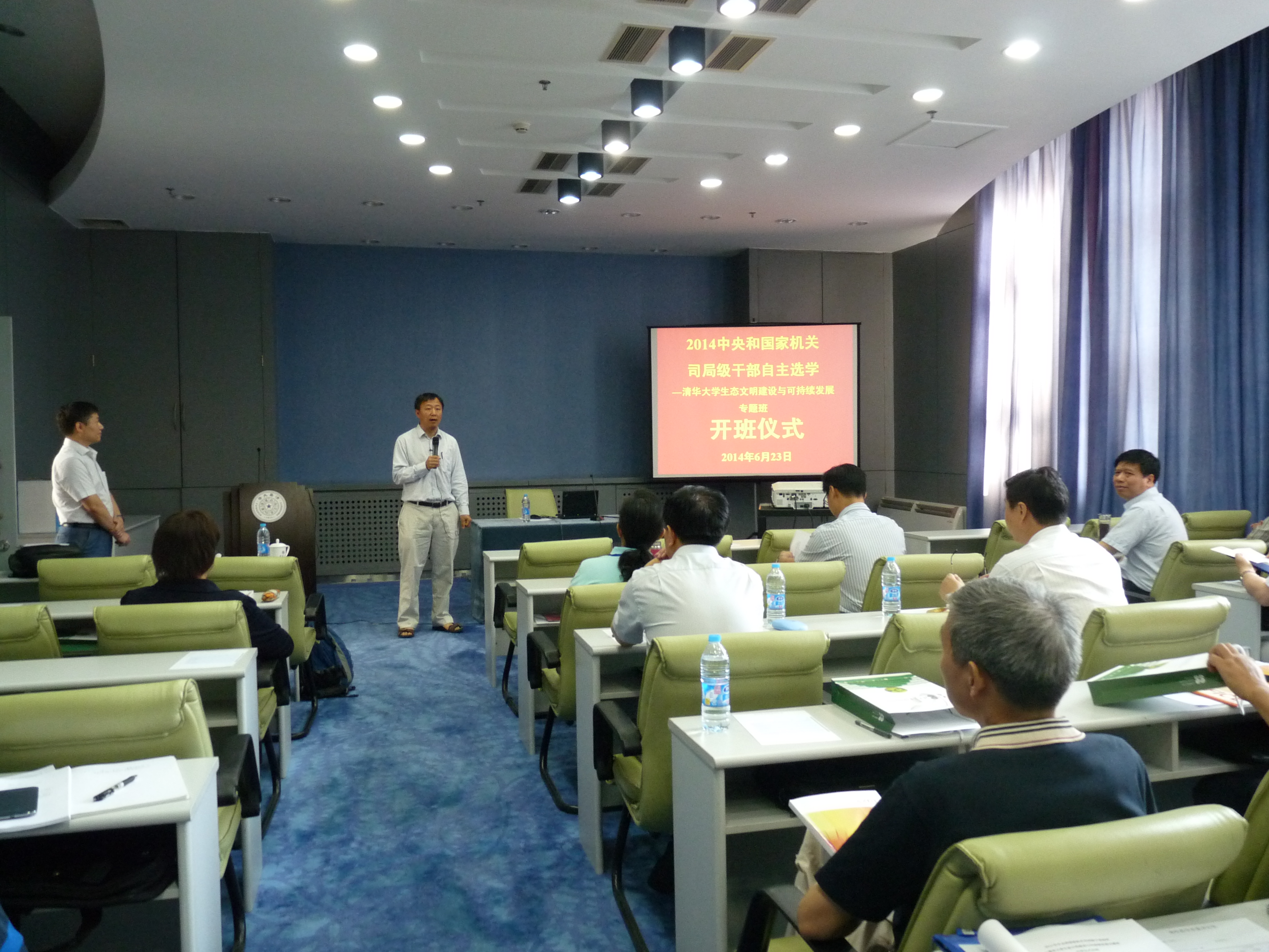 6月23日,2014年中央和国家机关司局级干部选学专题班“生态文明建设与可持续发展”在清华大学中央主楼327会议室开班。清华大学教培处处长邓丽曼、地球科学中心主任宫鹏出席开班仪式并致欢迎词。地球科学中心党总支副书记武海平主持仪式。