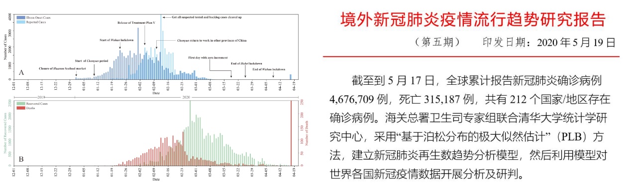 组图1所建数据库产出多项科技抗疫成果。成功由确诊病例数反推发病数据(左图以武汉为例);与清华大学统计中心合作撰写境外新冠肺炎疫情流行趋势研究报告递至海关总署卫生检疫司(右)