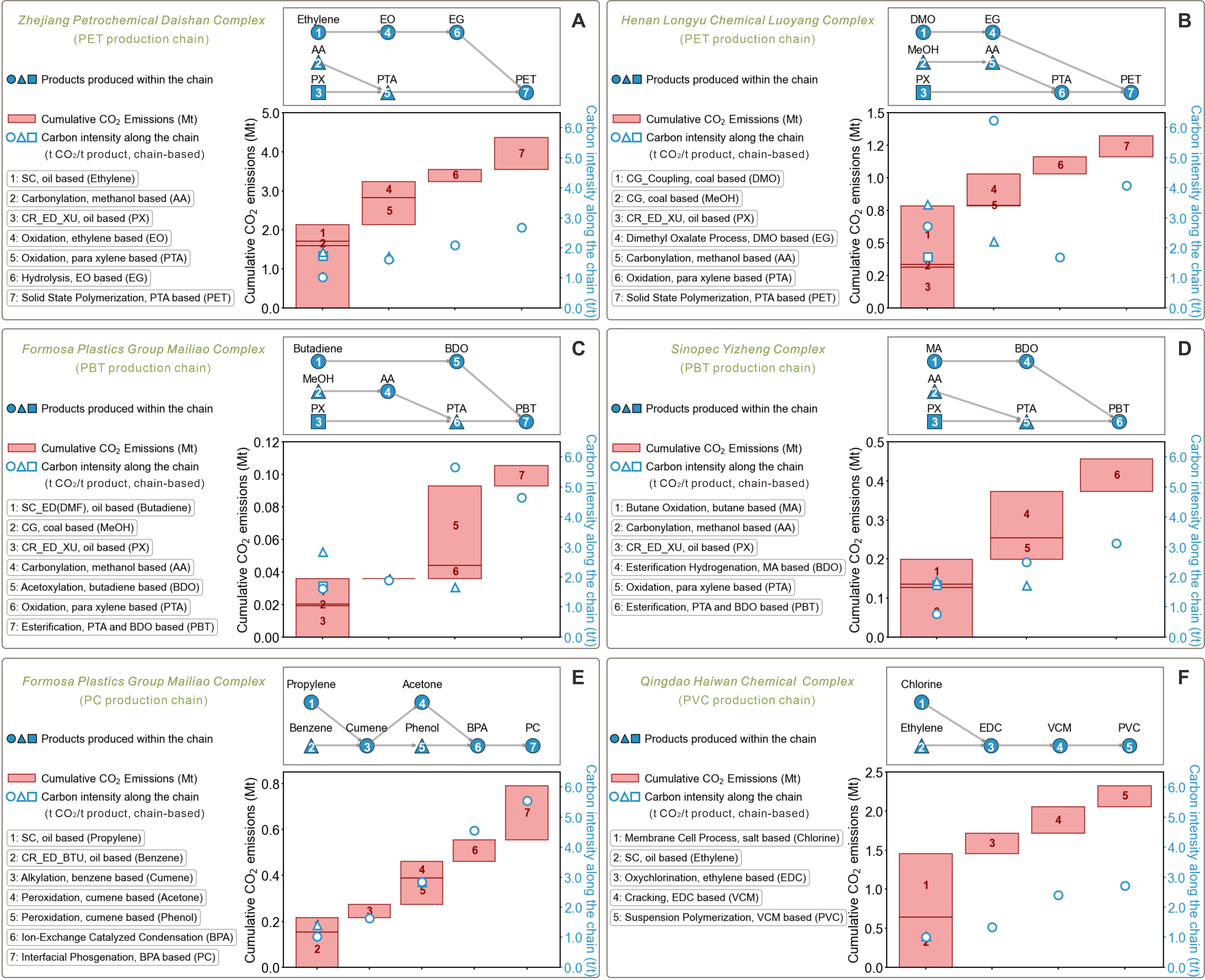 图3. 典型化工综合体关键产品生产链的碳排放与强度