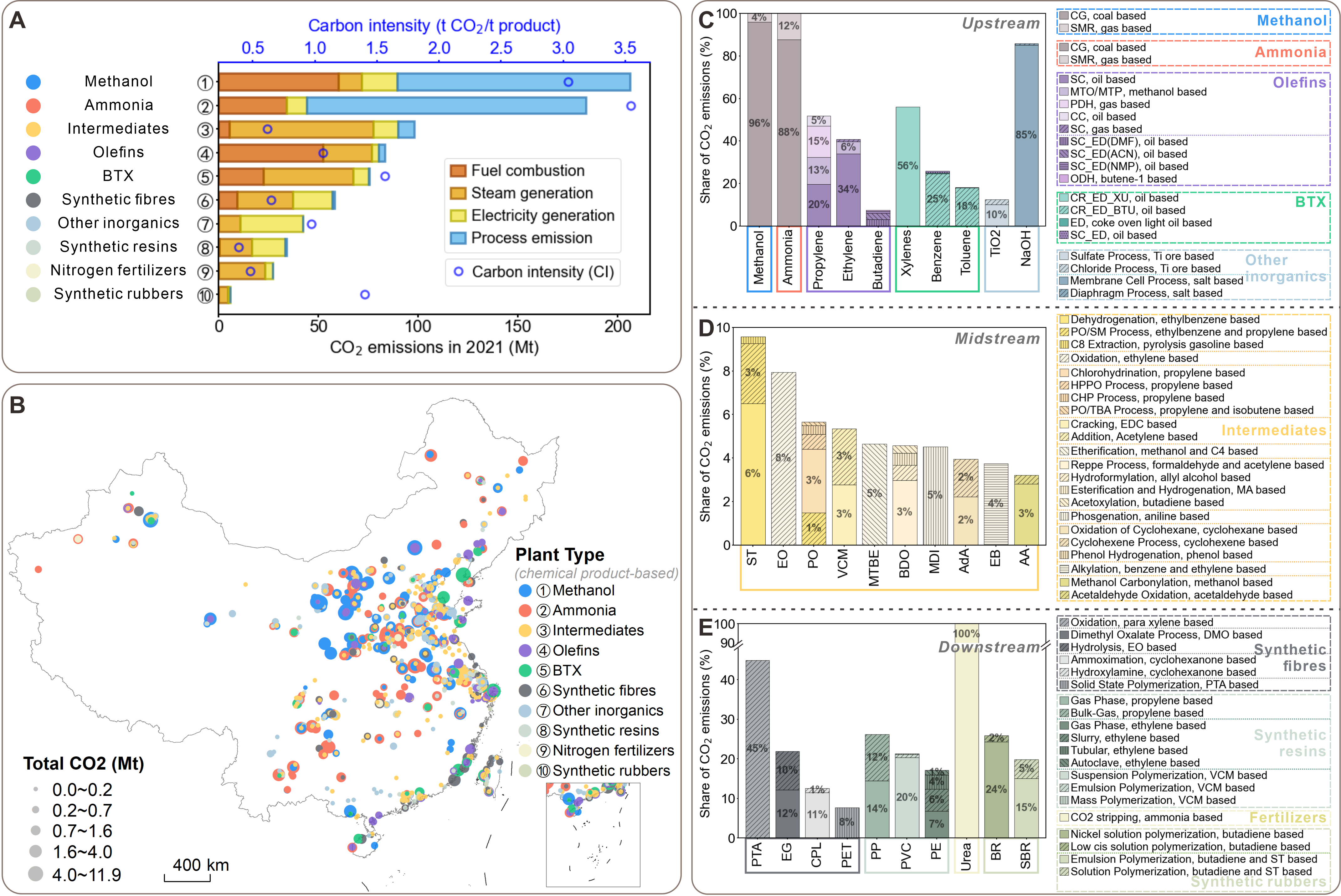 针对上述问题,清华大学地球系统科学系关大博教授研究团队系统厘清了中国石化化工行业“原料—工艺—产品”全流程投产关系,追溯具有中国特征的能耗与物耗数据,统一“工艺—工厂—链条—综合体”多层级核算框架,构建了覆盖123种化工产品、185种生产工艺的中国石化化工生产环节碳排放因子库。研究构建了全国石化生产工厂设施级年度二氧化碳排放清单(China Petrochemical CO2 Emission Inventory,CEADs-CPEI),将化工综合体内部产品链关系纳入统一分析框架,系统揭示了中国石化化工行业在产品、工艺和生产链环节上的排放结构及关键减排环节。