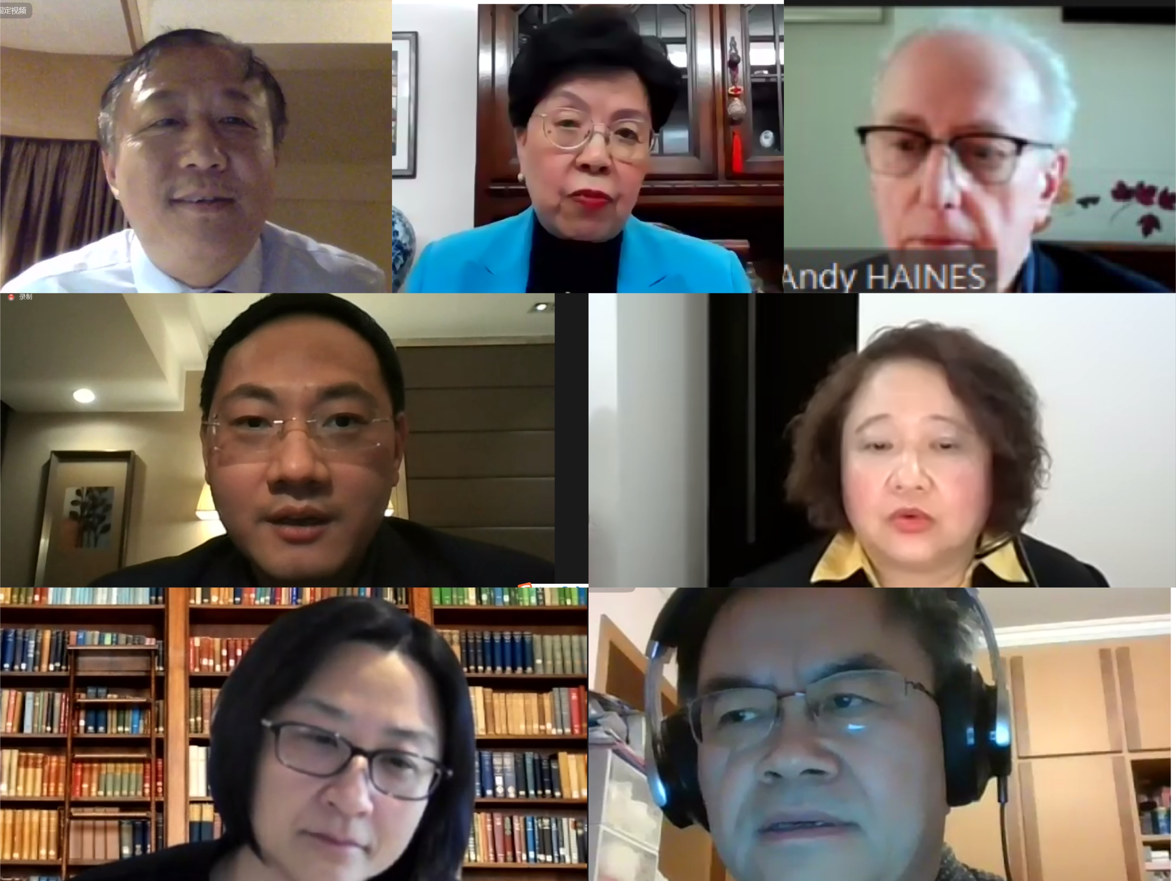 与会嘉宾参会的视频截图,从左至右、从上至下分别为宫鹏、陈冯富珍、安迪·海恩斯、黄存瑞、关美宝、叶志敏、刘起勇。