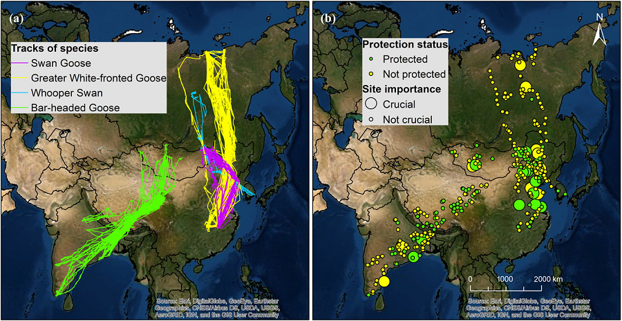 ——提出基于网络分析的迁徙鸟类栖息地优先保护策略 2019年8月,地学系宫鹏、司亚丽研究小组在保护生物学领域顶级期刊《Conservation Biology》上在线发表了题为“A network approach to prioritize conservation efforts for migratory birds”的研究论文,提出了基于网络分析的迁徙鸟类栖息地优先保护策略。 栖息地丧失导致的迁徙鸟类繁殖地和非繁殖地隔离会引发迁徙网络的瓦解。理论上,取决于该栖息地在迁徙廊道里的重要性,不同栖息地节点的丧失会对迁徙网络造成不同的影响。有的节点丧失导致种群数量下降,有的甚至导致物种灭绝。但目前对迁徙网络连通性以及栖息地丧失对迁徙网络影响的理解还不完善,对栖息地的优先保护还停留在依据单一栖息地本身特征阶段。 本研究基于东亚东澳大利亚和中亚迁徙路线上4种迁徙鸟类物种的GPS追踪数据,分别构建了迁徙网络,并提出了基于栖息地丧失和网络指标来衡量迁徙物种迁徙网络连通性的方法体系。研究组通过节点去除法...